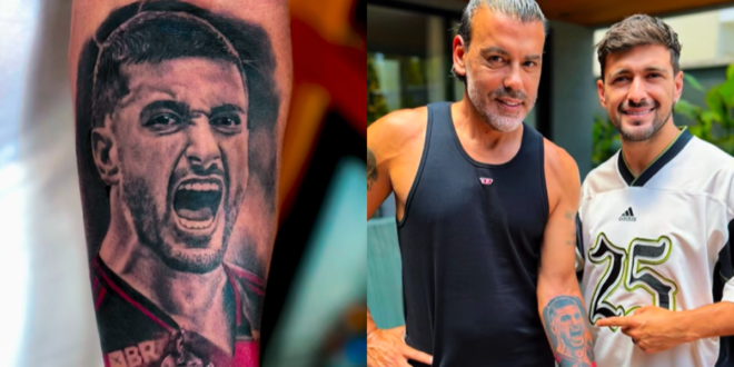 Em resumo, o empresário de Arrascaeta, Daniel Fonseca, usou as redes sociais para compartilhar a tatuagem que fez em homenagema o jogador. Em um vídeo, é possível ver o camisa 10 do Flamengo ‘incrédulo’ com a prova de amor do agente a amigo.