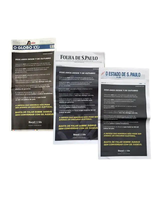 “Dois anos sem que o Presidente Lula recebesse os brasileiros sobreviventes do massacre do Hamas. Dois anos sem o presidente se encontrar com os familiares dos brasileiros assassinados pelo grupo terrorista. Dois anos sem Lula denominar o Hamas como organização terrorista. Dois anos em que o presidente fala sobre a comunidade judaica, mas não dialoga com ela. Dois anos em que assistimos ao aumento do antissemitismo no Brasil sem nenhuma ação efetiva do governo”, diz a advertência nos jornais.