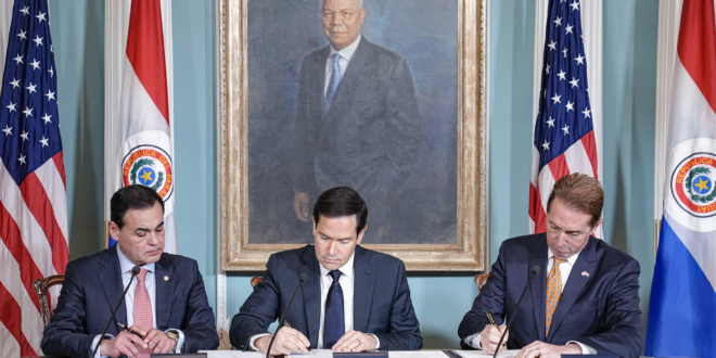 O secretário de Estado americano, Marco Rubio, e o ministro das Relações Exteriores paraguaio, Rubén Ramírez Lezcano, assinaram nesta quinta-feira (14) em Washington um Acordo de Terceiro País Seguro (STCA, na sigla em inglês) entre os Estados Unidos e o Paraguai.