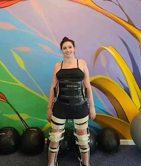 Na imagem compartilhada no Instagram, a ex-atleta aparece em pé durante um treino de fisioterapia, utilizando equipamentos de suporte que auxiliam na sustentação do corpo e no fortalecimento muscular.