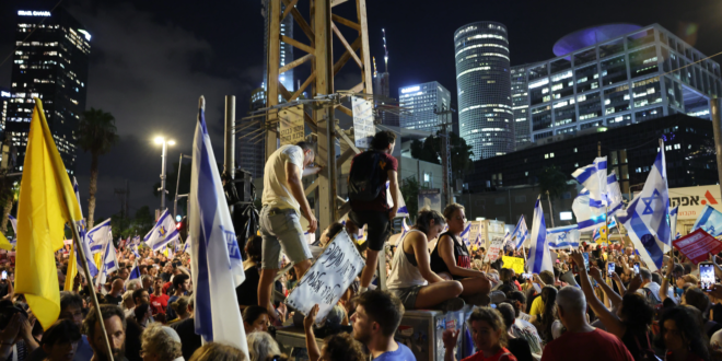 Manifestantes bloquearam algumas das principais rodovias, protestaram em suas cidades pela manhã e à noite marcharam rumo à Tel Aviv.