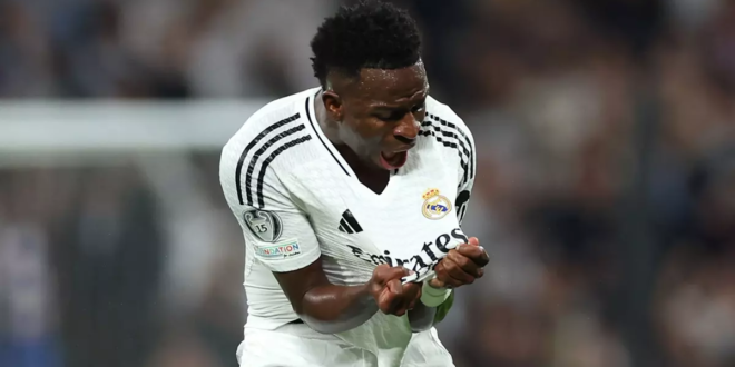 Na primeira partida na Inglaterra entre Manchester City e Real Madrid, os torcedores ingleses levaram uma bandeira para provocar Vinicius Júnior com os dizeres: “Pare de chorar”, em referência às reclamações do ex-Flamengo na premiação da Bola de Ouro.