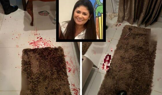 As fotos mostram o chão da casa ensanguentado logo após o feminicídio. Além da empresária, a filha do casal, de apenas 7 anos, também foi esfaqueada sete vezes, sendo quatro nas costas e três na parte frontal do corpo.