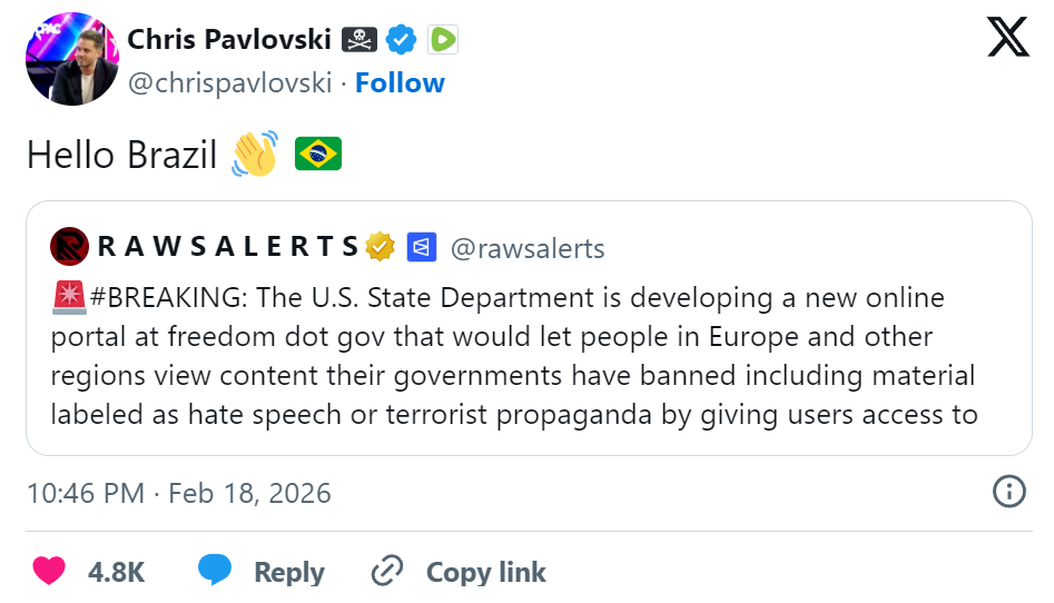 Ao compartilhar uma notícia sobre o lançamento do Freedom.gov, o CEO da plataforma de vídeos Rumble, Chris Pavlovski, publicou uma mensagem dizendo “Olá, Brasil”, em sua conta no X, um indicativo de que o site pode acabar servindo para disponibilizar aos brasileiros conteúdos que atualmente estão bloqueados no país por decisão do judiciário.