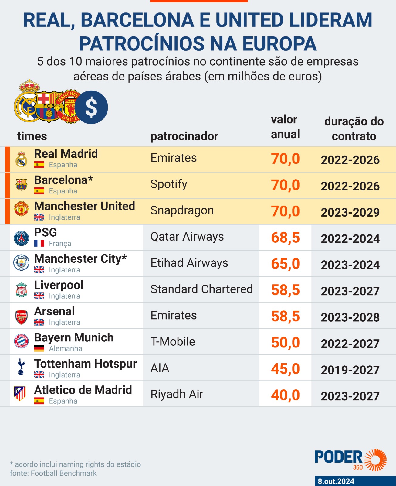 “O novo patrocínio master do Flamengo seria o nono maior da Europa, em termos de patrocínio em camisa de time. Colossal Flamengo”, disse João Guilherme em publicação no ‘X’, antigo Twitter. Fazendo um balanço das quantias que as equipes europeias arrecadaram com patrocínio master, o Rubro-Negro ultrapassaria o Tottenham (ING) no ranking, que recebe cerca de R$ 284 milhões.
