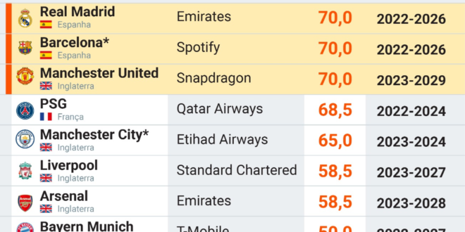 Os primeiros times desse ranking são Real Madrid (ESP), Barcelona (ESP) e Manchester United (ING), que arrecadam cerca de R$ 440 milhões. Na sequência aparecem clubes como PSG-FRA (R$ 433 milhões) e Manchester City-ING (R$ 410 milhões), que fecham o top-5 do quesito mencionado. Por fim, vale destacar que levantamento foi feito segundo o Football Benckmark, em 2024.