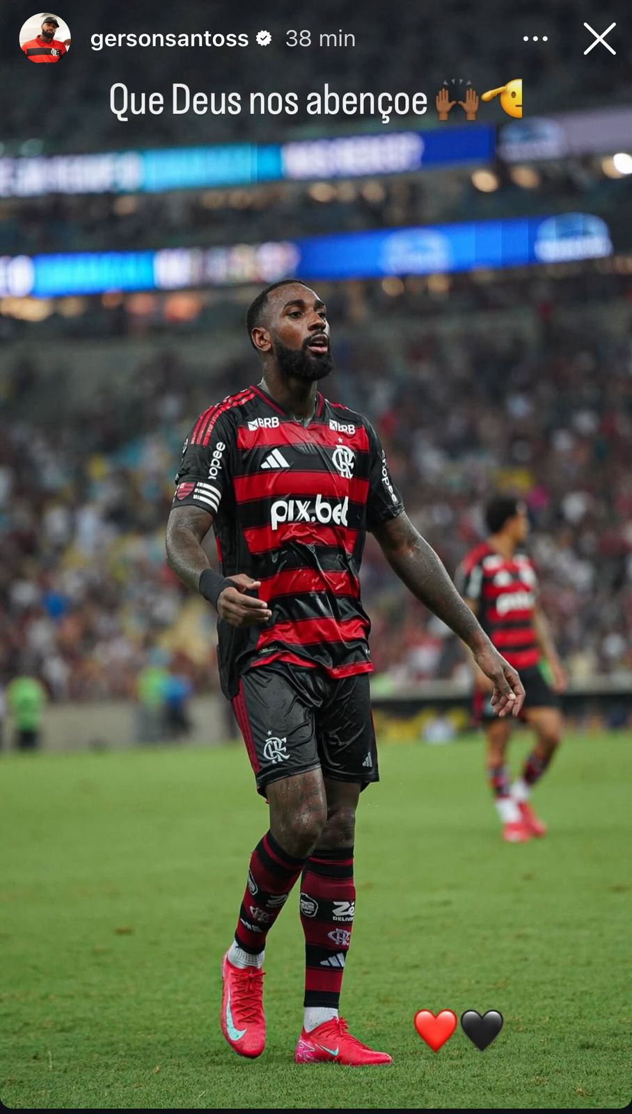 “Que Deus nos abençoe”, escreveu Gerson, em ‘stories’ no Instagram. Além da frase, o meio campista usou ‘emojis’ de corações, nas cores vermelha e preta. Por fim, o ‘Coringa’ postou uma foto atuando pelo Flamengo em algum jogo no Maracanã.