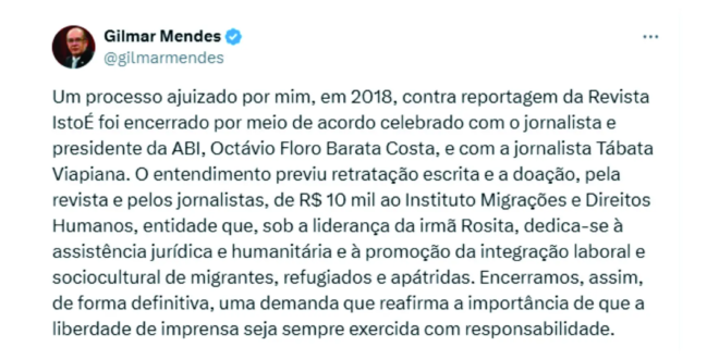 O ministro Gilmar Mendes, decano do Supremo Tribunal Federal (STF), firmou acordo judicial com os jornalistas Octávio Floro Barata Costa, presidente da Associação Brasileira de Imprensa (ABI), e Tábata Viapiana para encerrar a ação por danos morais movida contra eles por reportagem publicada na revista IstoÉ em 2017.