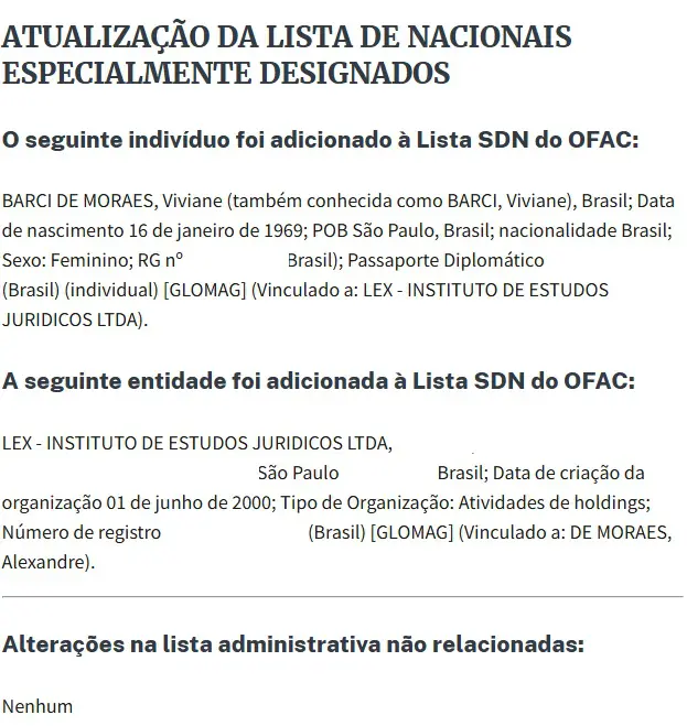 O Departamento do Tesouro também impôs sanções ao Instituto de Estudos Jurídicos Lex, fundado por Moraes em 2000, do qual Viviane e os filhos do casal são sócios atualmente.