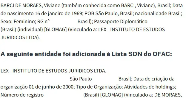 O Departamento do Tesouro também impôs sanções ao Instituto de Estudos Jurídicos Lex, fundado por Moraes em 2000, do qual Viviane e os filhos do casal são sócios atualmente.