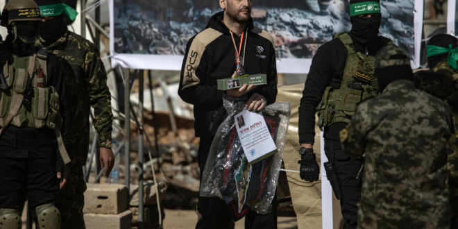 Além da ampulheta, os reféns foram forçados a segurar “certificados de libertação” e um bordado com um mapa das reivindicações territoriais palestinas. As imagens do momento mostram os três homens sendo escoltados por terroristas mascarados e fortemente armados antes de serem entregues à Cruz Vermelha.