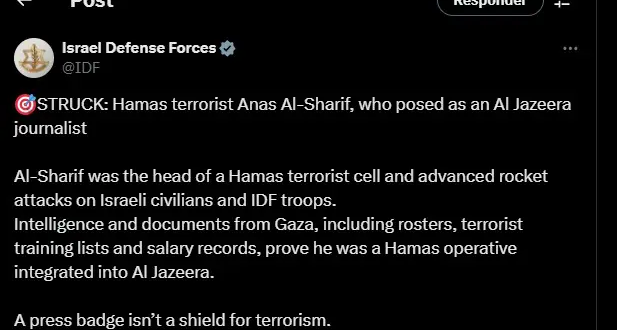 As Forças de Defesa de Israel (FDI) afirmaram neste domingo (10) que o jornalista palestino Anas Al Sharif, que prestava serviços para a emissora Al Jazeera, do Catar, morto em um ataque aéreo em Gaza, chefiava uma célula terrorista do Hamas responsável por lançar foguetes contra civis israelenses e tropas do país. O bombardeio que culminou na morte de Al Sharif foi realizado contra uma tenda próxima ao Hospital Al Shifa, na Cidade de Gaza, e também matou outros quatro jornalistas e dois civis, segundo a Al Jazeera.