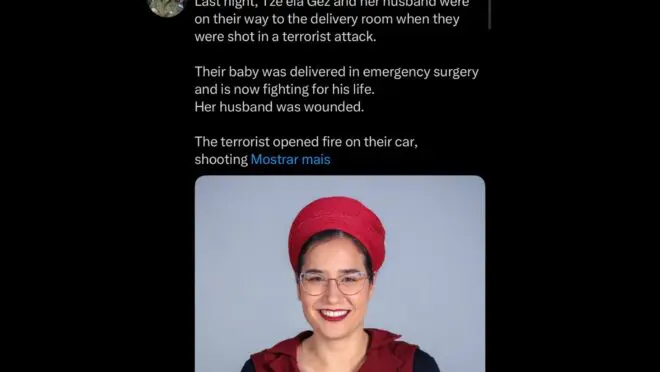 Uma mulher israelense, identificada como Tzeela Gez, foi assassinada em um ataque terrorista brutal nesta quinta-feira (15) a caminho do hospital para ganhar seu filho.