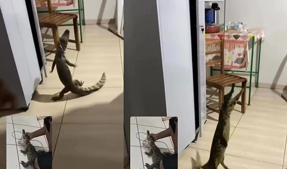 No registro, o jacaré está na cozinha da UBS, amarrado com o auxílio de uma corda, ainda apresentando agitação. De acordo com a enfermeira, o animal foi contido pelos próprios funcionários até ser retirado do local.