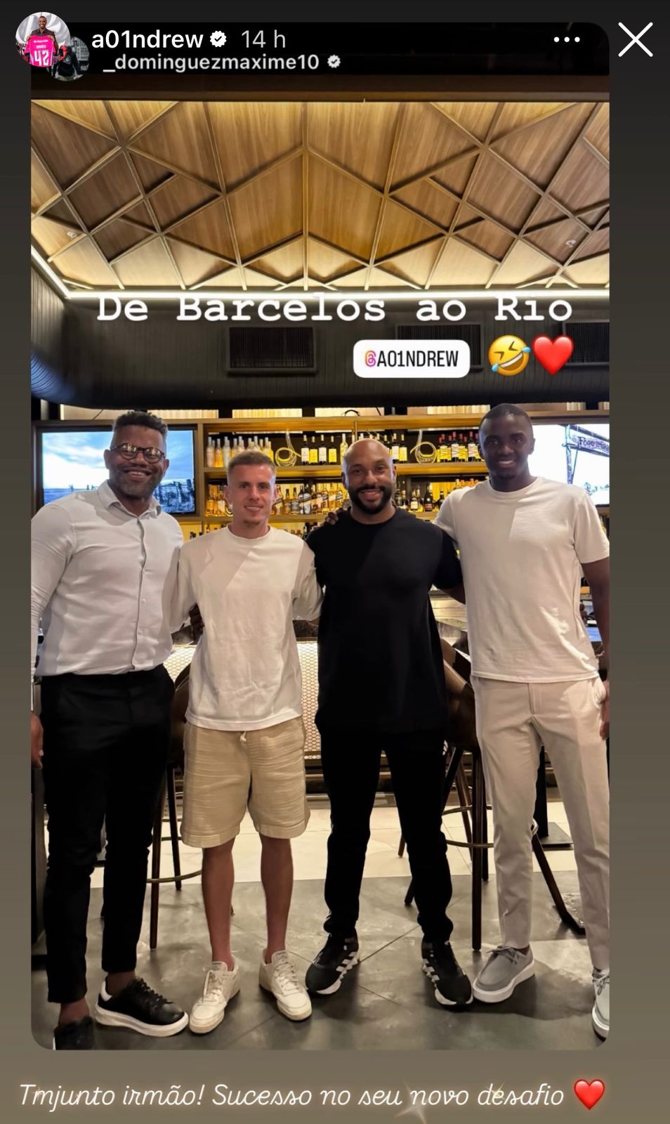 Por meio das redes sociais, Maxime Dominguez compartilhou uma foto na qual apareceu ao lado de Andrew. Além da imagem, o meio campista suíço escreveu a seguinte mensagem: “De Barcelos ao Rio de Janeiro”.