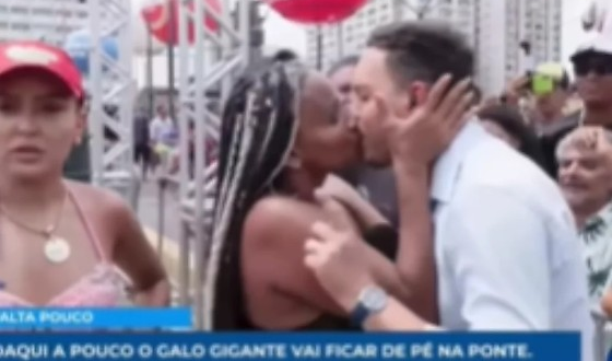 O repórter Rodrigo de Luna, da TV Jornal, afiliada do SBT em Pernambuco, foi surpreendido por uma foliã durante uma cobertura de pré-Carnaval do Galo da Madrugada, um dos blocos mais tradicionais do estado.