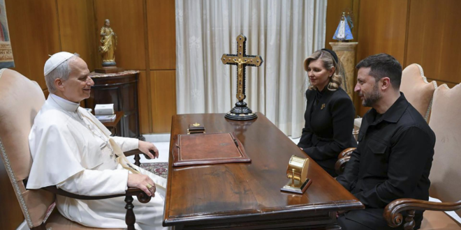O papa Leão XIV recebeu neste domingo (19), no Vaticano, o presidente da Ucrânia, Volodymyr Zelensky, que havia participado horas antes da missa de início oficial do pontificado do novo pontífice. Zelensky esteve acompanhado pela primeira-dama, Olena Zelenska, e por membros de sua comitiva, incluindo o ministro das Relações Exteriores, Andrii Sibiga, o chefe do gabinete presidencial, Andriy Yermak, e o embaixador da Ucrânia junto à Santa Sé, Andrii Yurash.
