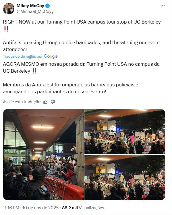 O ex-chefe de gabinete de Charlie Kirk e da Turning Point, Michael McCoy, compartilhou imagens dos protestos violentos em Berkeley. Crédito: Reprodução/X/@Michael_McCoyy