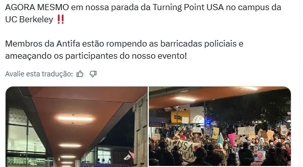 A Universidade de Berkeley, na Califórnia, foi palco de protestos e confrontos violentos na véspera de um encontro organizado pelo Turning Point, movimento fundado pelo ativista conservador Charlie Kirk, morto a tiros em setembro enquanto discursava em outro evento universitário.