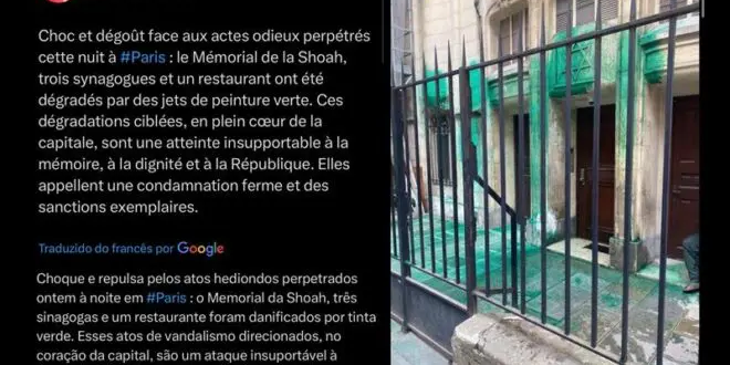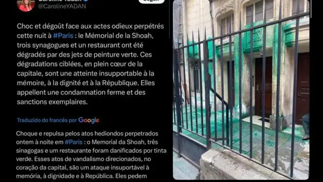 Vandalismo no Memorial do Holocausto e sinagogas em Paris apontam a crescente ameaça a judeus na Europa. Crédito: Reprodução/X/@CarolineYADAN