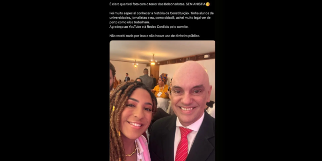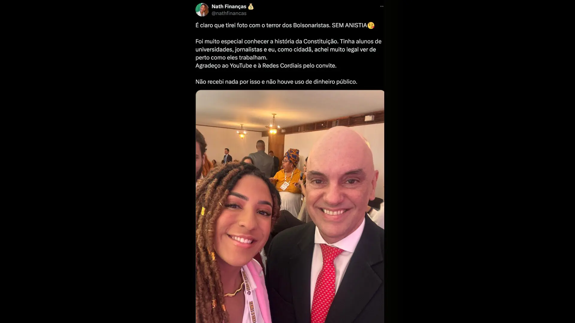 “É claro que tirei foto com o terror dos Bolsonaristas. SEM ANISTIA”, dizia a legenda da postagem de uma selfie da economista conhecida como “Nath Finanças” com Alexandre de Moraes após o evento promovido pelo STF.