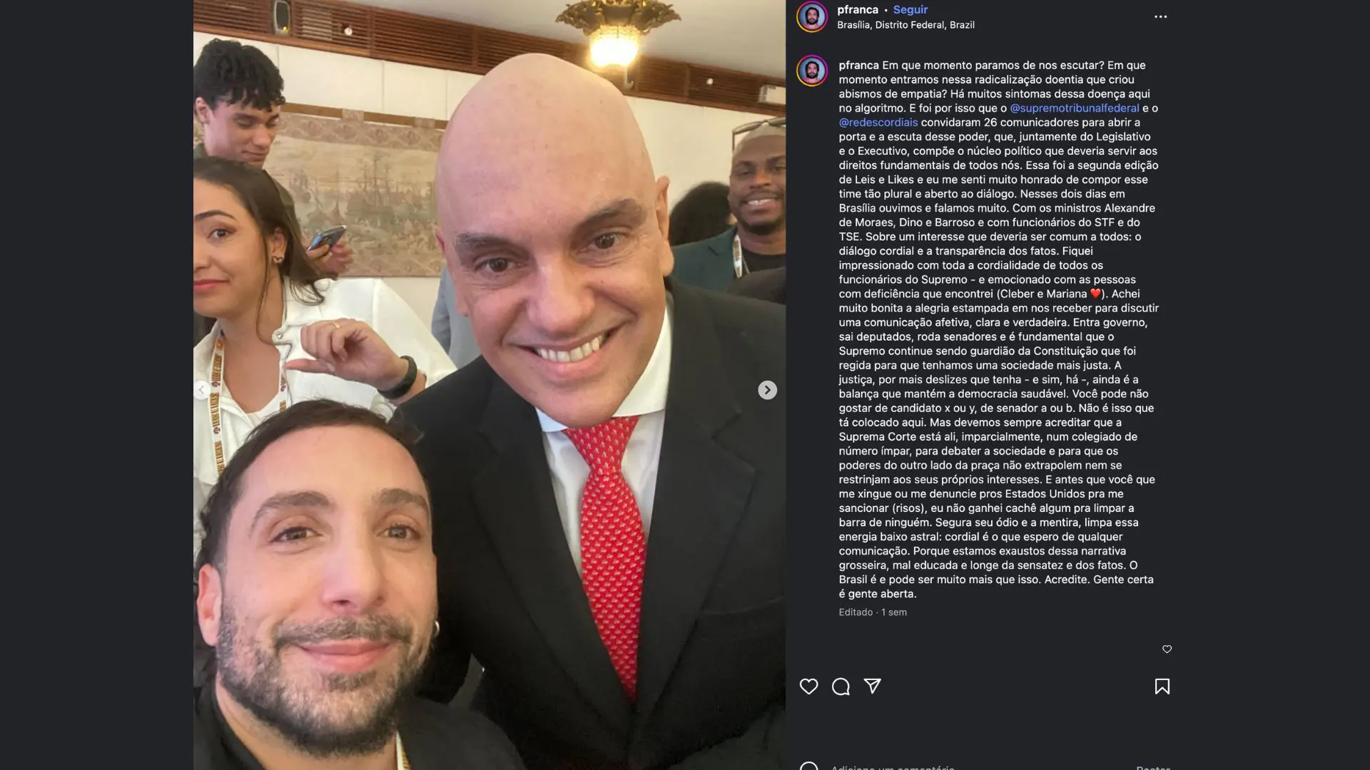 Nos dias que se seguiram ao evento, vários dos influenciadores participantes já foram às redes em campanha para promover uma imagem positiva do STF e, em especial, de Alexandre de Moraes. Veja alguns exemplos: