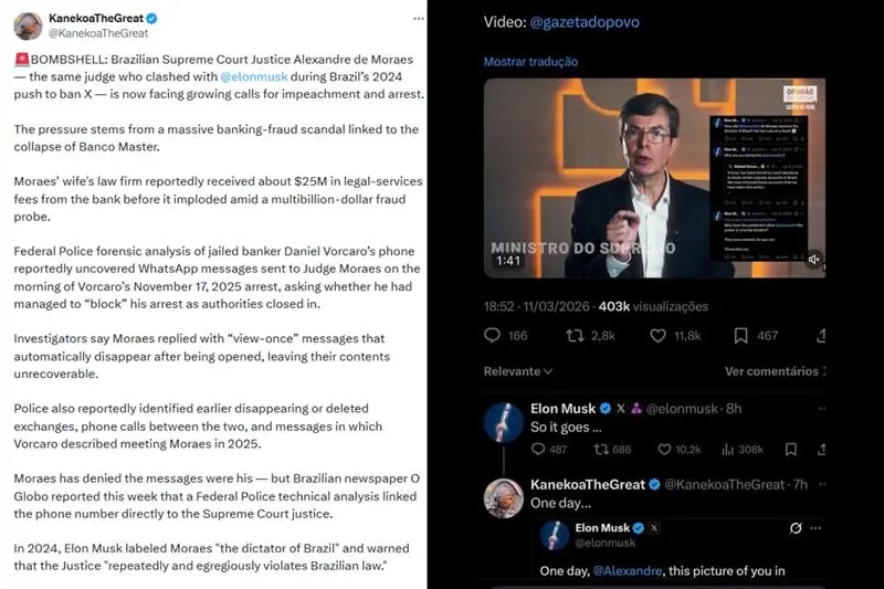O empresário Elon Musk reagiu a um vídeo que viralizou na rede social X nesta quarta-feira (11), que expõe o escândalo do Banco Master e as investigações que conectam o ministro do Supremo Tribunal Federal Alexandre de Moraes ao caso.