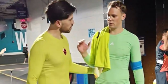 Após a vitória do Bayern de Munique, que culminou na eliminação do Flamengo no Mundial de Clubes, Neuer e Rossi foram vistos compartilhando um momento de descontração nos corredores do Hard Rock Stadium, em Miami. Isso porque, as câmeras de transmissão flagraram os goleiros posando para uma foto.