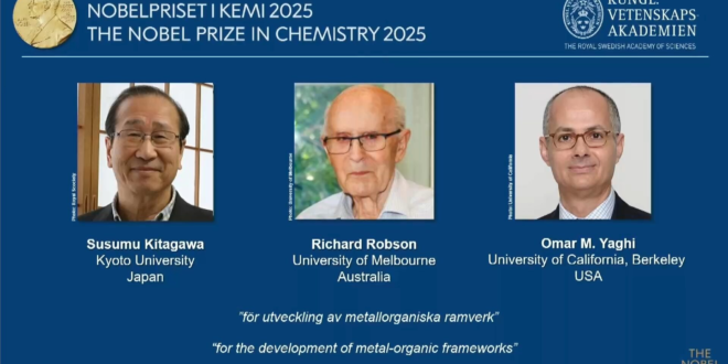 Três cientistas foram laureados com o Prêmio Nobel de Química 2025 pelo “desenvolvimento de estruturas metal-orgânicas”, segundo anunciou a Academia de Ciências nesta quarta-feira (8).