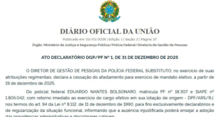 A Polícia Federal (PF) publicou no Diário Oficial da União (DOU) desta sexta-feira (2) uma ordem para que Eduardo Bolsonaro (PL-RJ) retorne ao seu posto de trabalho, no Rio de Janeiro. Cassado por faltas, o ex-deputado é escrivão desde 2010 e está há 10 anos afastado da PF para o exercício do mandato parlamentar. Na publicação no DOU, o diretor …