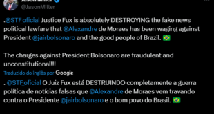 O estrategista do presidente dos Estados Unidos, Donald Trump, Jason Miller, comemorou nesta quarta-feira (10) o voto do ministro Luiz Fux, do Supremo Tribunal Federal (STF), que rejeitou a acusação de organização criminosa contra o ex-presidente Jair Bolsonaro e outros sete réus investigados pela suposta tentativa de golpe de Estado no Brasil. “O ministro Fux está absolutamente destruindo o falso …