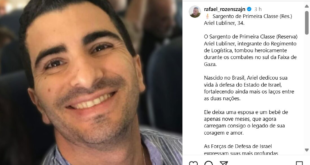 As Forças de Defesa de Israel (FDI) informaram, na noite deste sábado (30), que o soldado Ariel Lubliner, de 34 anos, foi morto durante confrontos em Khan Younis, no sul da Faixa de Gaza. Lubliner era brasileiro e havia imigrado para Israel há dez anos. Ele deixa a esposa, Barbara, uma imigrante espanhola, e o filho de nove meses, Lior. …