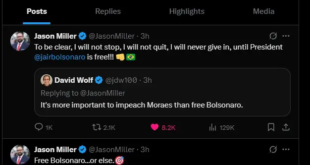 Jason Miller, estrategista de campanha do presidente Donald Trump que já foi detido no Brasil por ordem do ministro Alexandre de Moraes, afirmou neste domingo (10) que seu objetivo é a liberdade de Jair Bolsonaro. “Para deixar claro, não vou parar, não vou desistir, nunca vou desistir até que o presidente Jair Bolsonaro esteja livre”, escreveu em seu perfil no …