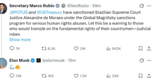 O empresário americano de origem sul-africana Elon Musk, dono do X, comemorou na tarde desta quarta-feira (30) as sanções que o governo Donald Trump impôs ao ministro do Supremo Tribunal Federal (STF) Alexandre de Moraes, com base na Lei Magnitsky, que visa acusados de violar direitos humanos e de corrupção. Musk, que no ano passado protagonizou uma disputa com Moraes, …