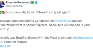O deputado federal Eduardo Bolsonaro (PL-SP) agradeceu nesta quarta-feira (9) o apoio do congressista norte-americano Cory Mills, aliado do Partido Republicano, por manifestações em defesa do ex-presidente Jair Bolsonaro e críticas ao ministro Alexandre de Moraes, do STF. Segundo Eduardo, os “brasileiros são gratos” ao parlamentar da Flórida por abraçar o que chamou de “causa da liberdade”. A mensagem foi …