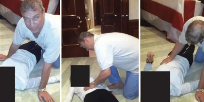 Em uma das fotografias, ele aparece debruçado sobre uma mulher deitada no chão. Em outra, ele posiciona a mão no abdômen da mesma pessoa não identificada, enquanto uma terceira figura não identificada apoia os pés em uma mesa atrás dos dois.