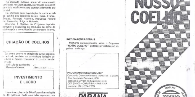 “Uma área coberta de 80 m² permite a criação de 40 matrizes. Cada uma delas reproduz, em média, 36 animais para abate por ano”, dizia um folder explicativo do programa da época. “Bem administrada, a criação de coelhos pode proporcionar uma renda de 04 (quatro) salários mínimos por mês.”