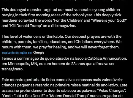 A secretária de Segurança Interna dos Estados Unidos, Kristi Noem, confirmou em publicação no X nesta quarta-feira (27) que o autor do massacre na Annunciation Catholic Church, em Minneapolis (Minnesota), era um transgênero de 23 anos. O ataque ocorreu durante a primeira missa do ano letivo da escola da igreja e deixou duas crianças mortas, bem com outras 17 pessoas feridas, a maioria menores.