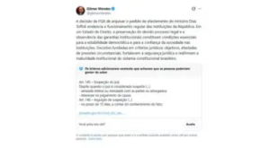 Gilmar Mendes volta a defender Toffoli nas redes sociais