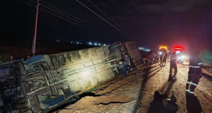 Reprodução Apesar do acidente, não houve obstrução da pista e o tráfego segue normalizado no trecho. Reprodução Apesar do acidente, não houve obstrução da pista e o tráfego segue normalizado no trecho. THIAGO NOVAES DO REPÓRTERMT Um ônibus com 26 passageiros saiu da pista e tombou no km 678 da BR-163, em Lucas do Rio Verde (a 333 km de Cuiabá), em …