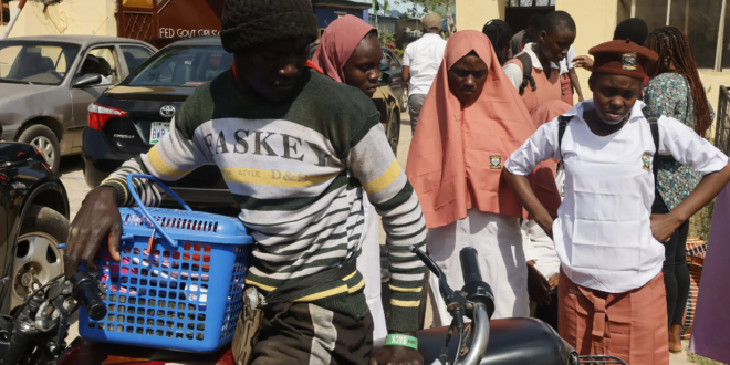 Pais buscam suas filhas no Federal Government Girls’ College, em Bwari, Abuja, Nigéria, em 22 de novembro de 2025. O governo federal da Nigéria ordenou o fechamento temporário de 41 escolas federais de unidade devido ao aumento dos casos de sequestro em todo o país. EFE/EPA/AFOLABI SOTUNDE (Foto: EFE)