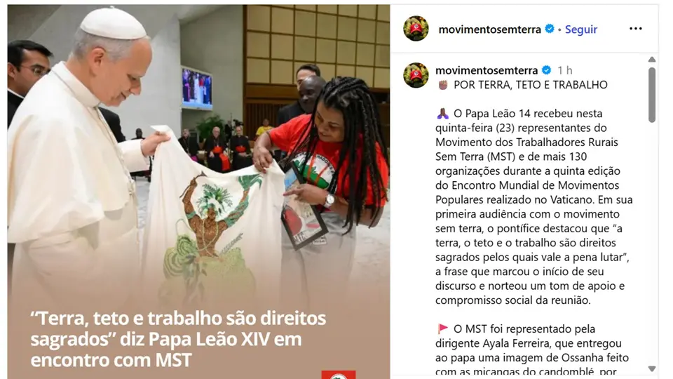 “A Igreja apoia suas justas lutas por terra, moradia e trabalho. Como meu antecessor Francisco, acredito que os caminhos certos começam de baixo e da periferia para o centro. Suas inúmeras e criativas iniciativas podem se transformar em novas políticas públicas e direitos sociais”, acrescentou Leão XIV.