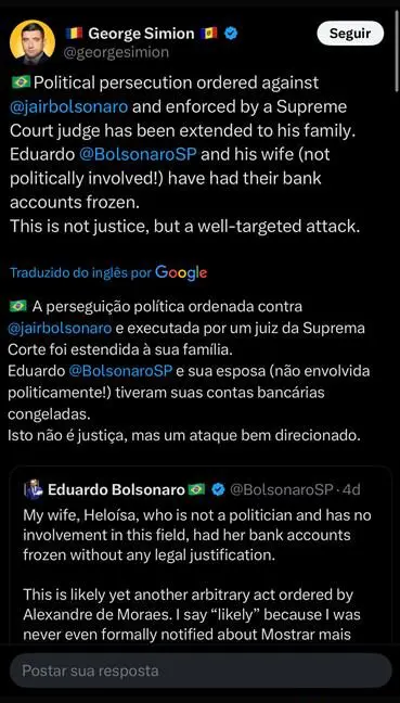 Simion continuou: “Eduardo e sua esposa (não envolvida na política!) tiveram suas contas bancárias congeladas. Isso não é justiça, mas um ataque bem direcionado”, compartilhando uma publicação do congressista brasileiro que está nos Estados Unidos em licença desde março.