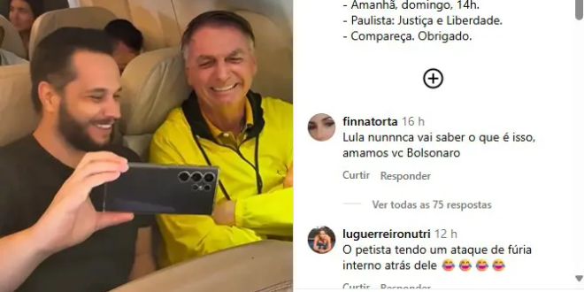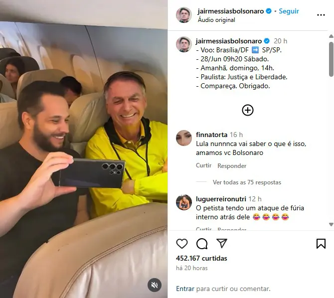 Dezenas de passageiros de um voo comercial de Brasília para São Paulo aplaudiram o ex-presidente Jair Bolsonaro e fizeram fila neste sábado (28) para cumprimentar e tirar selfies com ele. As imagens do apoio recebido dentro da aeronave foram publicadas pelo ex-presidente em seu perfil no Instagram com um convite para que o Brasil compareça ao ato na Avenida Paulista marcado para este domingo, às 14h. “Paulista: Justiça e Liberdade. Compareça”, escreveu Bolsonaro.