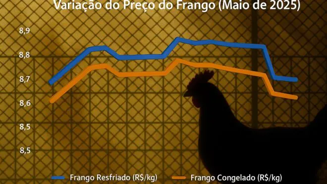 Em relação à ave congelada, a conta é parecida. O maior valor da série história medido pelo CEPEA aconteceu em 15 de abril deste ano: R$ 8,77 por quilo no atacado. No dia 16 deste mês, o preço do frango congelado era de R$ 8,70/quilo.