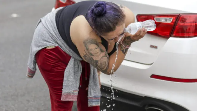 Manifestante limpa os olhos em razão das bombas de gás lacrimogêneo. (Foto: EFE/Allison Dinner)