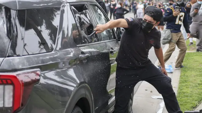 Manifestante quebra vidro de carro em protesto no último sábado. (Foto: EFE/Allison Dinner)
