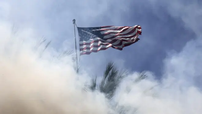 Bandeira americana tremula em meio a fumaça em protesto. (Foto: EFE/Allison Dinner)