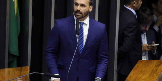 Eduardo Bolsonaro foi aos EUA e pediu licença parlamentar não remunerada de 122 dias em março para permanecer no país americano sem perder o mandato parlamentar. Ele diz que está nos EUA para combater as ameaças à liberdade de expressão no Brasil.