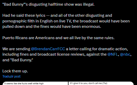 O congressista incluiu em suas críticas traduções para o inglês de letras de músicas de Bad Bunny com termos como “dick”, “ass” e “fuck”, palavras que, segundo o parlamentar, são proibidas na televisão aberta nos Estados Unidos. A imprensa americana afirma que o cantor omitiu tais palavras durante a transmissão do show.